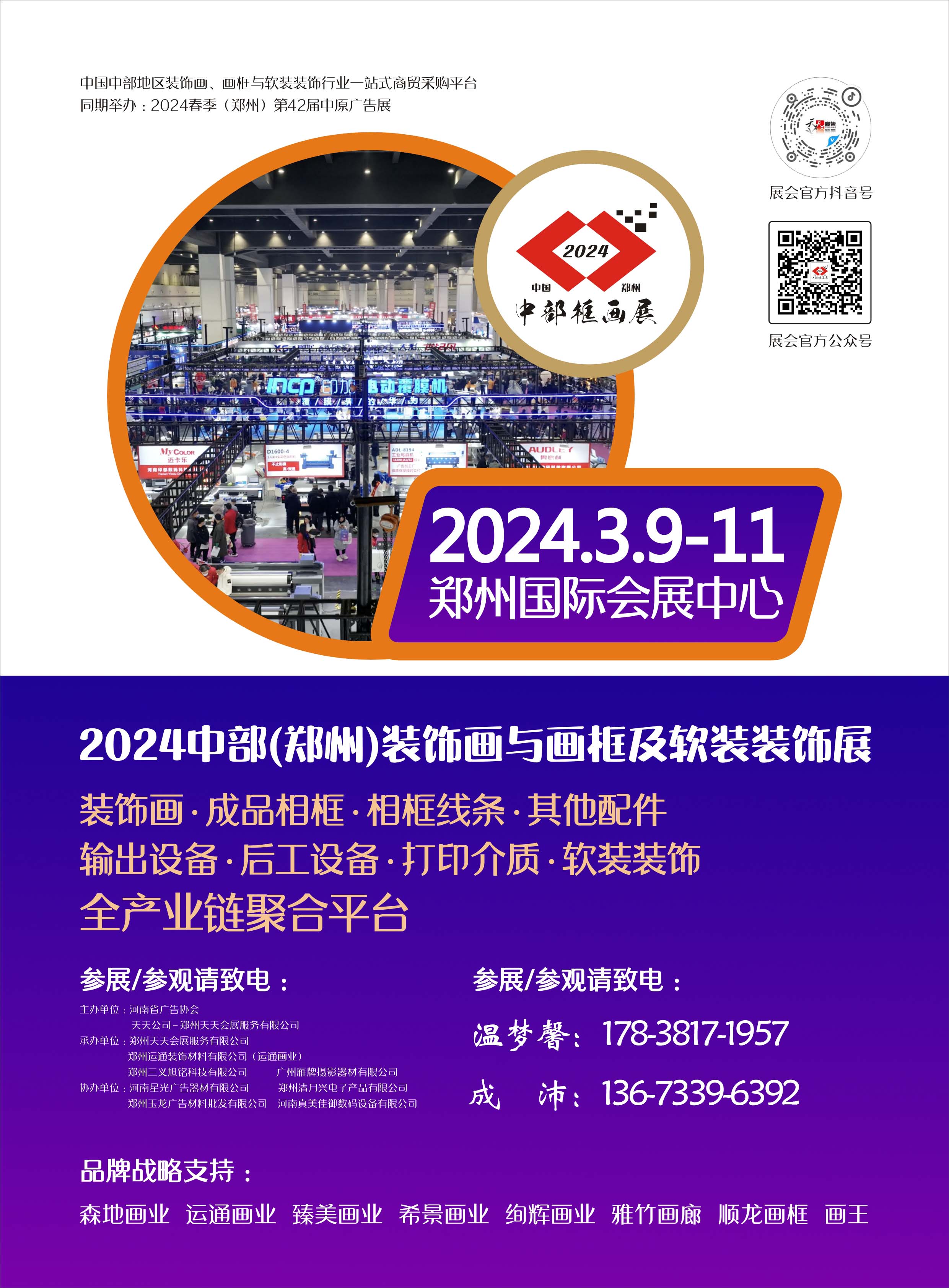 中部框畫展,是由河南省廣告協(xié)會(huì)與天天公司聯(lián)合主辦,鄭州天天會(huì)展服務(wù)有限公司、鄭州運(yùn)通裝飾材料有限公司(運(yùn)通畫業(yè))、鄭州三義旭銘科技有限公司、廣州雁牌攝影器材有限公司聯(lián)合承辦的中部地區(qū)范圍內(nèi)裝飾畫、畫框與軟裝裝飾行業(yè)全產(chǎn)業(yè)鏈的綜合性展覽會(huì)。